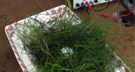 infrared light: since grass transpires to cool itself slightly, compared to an inanimate